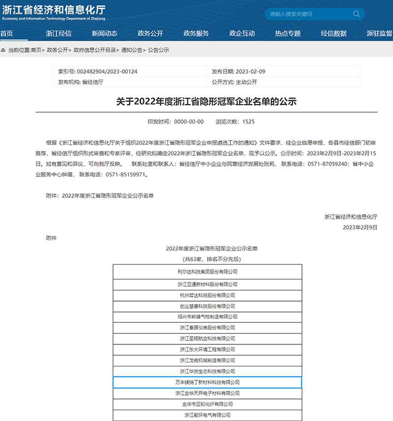 萬(wàn)豐鎂瑞丁獲評(píng)2022年度浙江省隱形冠軍企業(yè)