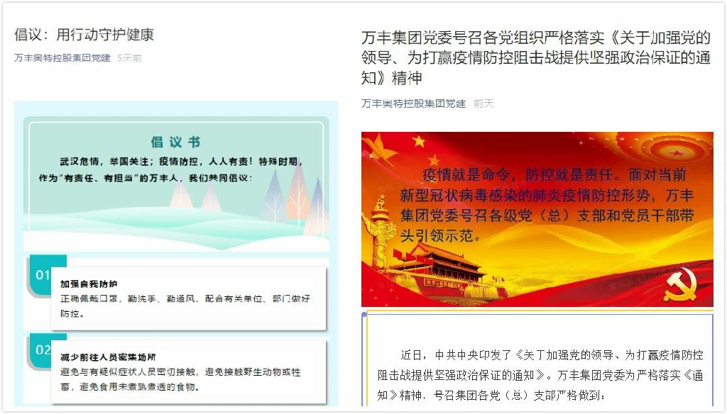 新型肺炎疫情爆發后,萬豐集團第一時間成立了由黨委書記、董事局主席陳愛蓮親任組長、總裁任執行組長的防疫工作小組,召開視頻會議專題,聽取公司防疫準備落實情況并部署全面抗疫防控的各項工作。向全集團連續兩次發布《關于加強新型肺炎疫情防控工作的通知》及《關于進一步做好新型冠狀病毒感染的肺炎疫情防控工作的通知》,制訂完善疫情防控應急預案展開“硬核”防控。關鍵時刻,萬豐集團各級部門擔當起組織、宣傳、凝聚、服務集團職工群眾的重責大任。